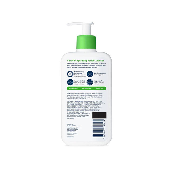 A cleanser can remove dirt, makeup and other debris, but a hydrating cleanser, like CeraVe Hydrating Facial Cleanser, can do all that without disrupting the skin’s natural protective barrier or stripping the skin of its natural moisture. Developed with dermatologists, CeraVe Hydrating Facial Cleanser is a gentle face wash with ingredients like ceramides and hyaluronic acid that work to restore the skin’s natural barrier to help the skin lock in moisture. CeraVe Hydrating Cleanser was designed to cleanse and refresh the skin without over-stripping it or leaving it feeling tight and dry. Featuring hyaluronic acid to hydrate the skin and 3 essential ceramides that work together to lock in skins moisture and help restore your skin’s protective barrier.