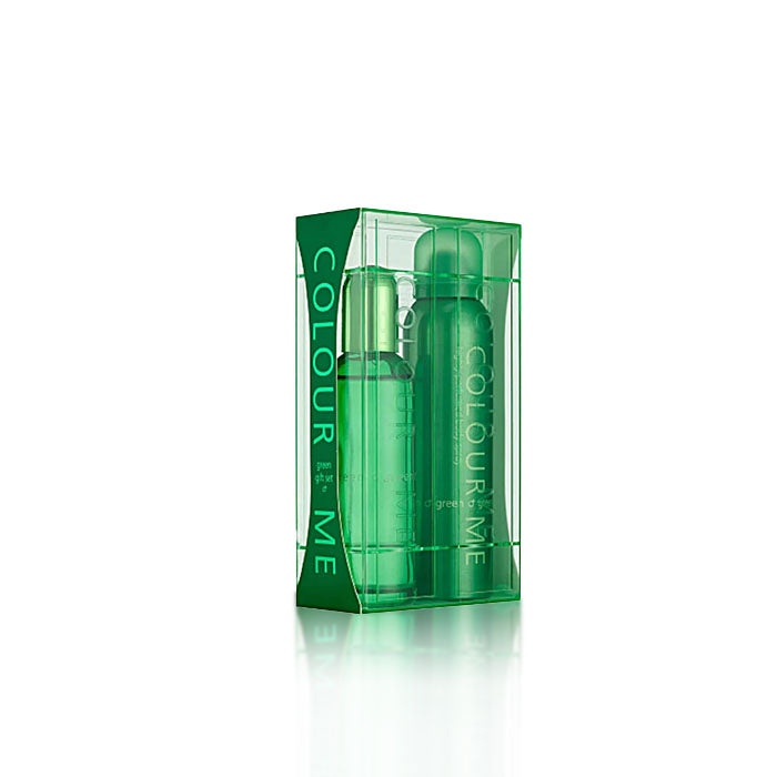 Rich, woody and fresh. Add to your collection with colour me green, a rich and woody mean fragrance. Fresh citrus accords of bergamot and lemon entwine with a rich floral heart of rose, lily, Jasmin and patchouli resting on a warm and long-lasting vanilla, woody, amber base. Feel fresh with citrus, rose and patchouli, while enjoying the longer-lasting scents of vanilla and amber. Colour me green - fragrance for men - gift set,