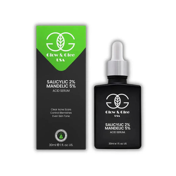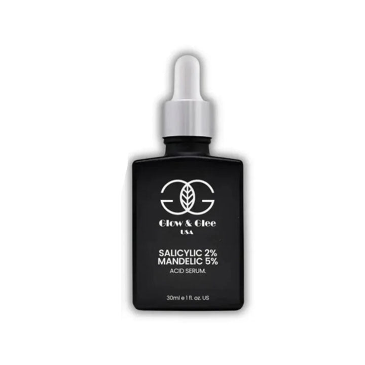 Unlock the power of blemish free skin with Glow & Glee's Salicylic 2% Mandelic Acid Serum Developed by dermatologists, this water-based serum combines the dual benefits of Salicylic Acid and Mandelic Acid to specifically target blemish prone skin and dark spots by visibly reducing congestion and textural irregularities, it reveals brighter, clearer skin while effectively removing dead skin cells that can clog pores
