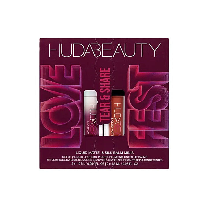 A Lovefest limited-edition set of 2 mini–Liquid Matte Lipsticks and 2 mini tinted Silk Balms in complementing shades, complete in an irresistibly cute tear and share pack. Split with your loved one or bestie!