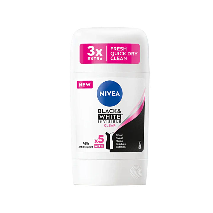 The anti-perspirant stick with patented emulsion technology for 48h gentle protection and smooth application. Provides you with an extra fresh skin feel. With white mark protection on black clothing & anti-yellow staining on white clothing: NIVEA Black & White Clear Anti-Perspirant Stick.
