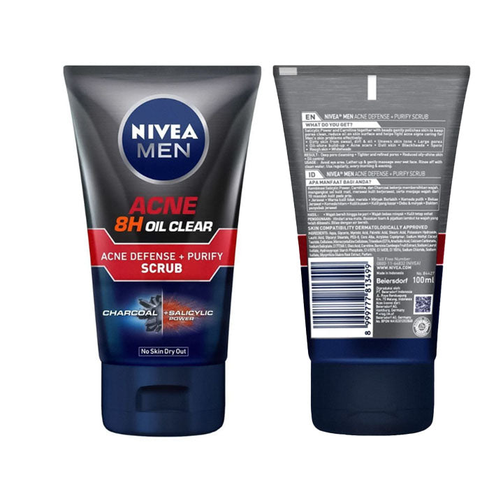 Nivea Men Acne 8H Oil Clear Acne Defense+Purify Charcoal Scrub is specifically designed to combat acne and oily skin. The charcoal-infused formula effectively removes excess oil, dirt, and impurities, helping to prevent breakouts. The gentle scrub particles exfoliate your skin, leaving it smooth and refreshed. The 8-hour oil control formula makes your skin stay matte and shine-free throughout the day. Ideal for daily use, this 100ml tube helps maintain clear, healthy skin, making it a staple in any grooming routine for men with oily or acne-prone skin.