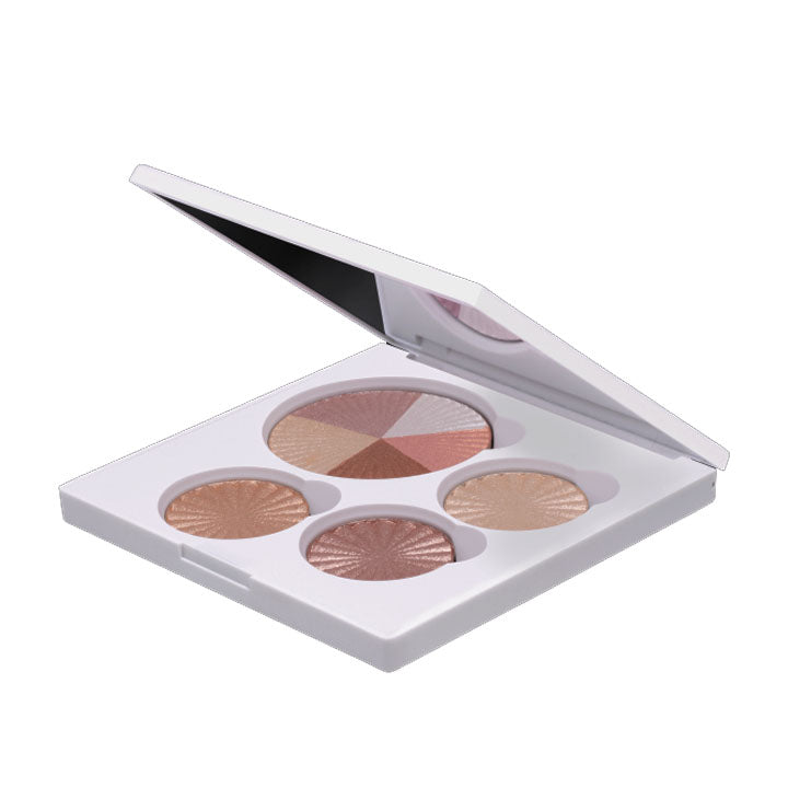 Have an unquenchable need for glow? Glaze those cheeks and everything else with our NEW format highlighter palette. With a full-size Beverly Hills, and Minis of Rodeo Drive, Blissful, and Star Island, your glow goals will hit ultralight with these smooth, beaming, and shook-inducing highlighters. Hit pan? Refill or remix the shades in this magnetic palette that is perfect for travel and has a full-sized mirror.