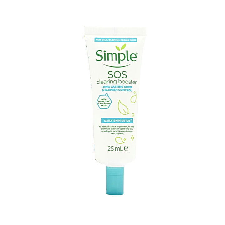Simple Daily Skin Detox SOS Clearing Booster is made with a detoxifying blend of concentrated 10% witch hazel, thyme and zinc, to provide long-lasting results against oily skin and blemishes whilst being gentle on your skin.