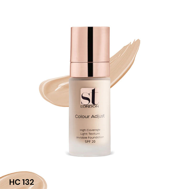 The ST London Colour Adjust Foundation in shade HC-132 is a versatile foundation designed to seamlessly blend with your skin tone for a flawless, natural look. Its adaptive formula provides medium to full coverage while feeling lightweight on the skin, allowing for comfortable wear throughout the day. Enriched with SPF 20, it offers protection against harmful UV rays, making it an excellent choice for daily use. Shade HC-132 is perfect for light to medium skin tones, providing a smooth, radiant finish that enhances your complexion.