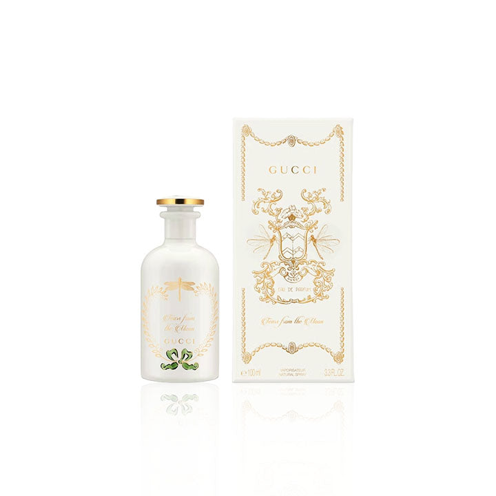 Gucci Beauty unveils its fragrance with the evocative name Tears from the Moon. The free and joyful spirit of a dragonfly represents this illuminating Gucci perfume built around a white floral bouquet of White Peony, Lily of the Valley and Stephanotis. The airy, floral White Peony is a symbol of richness and honour. Fresh and with an animalic hint, it is enriched by the green dewiness of Lily of the Valley at its heart. The radiant Stephanotis, also known as Madagascar jasmine, unlocks the secret of this elegant spring bouquet. Tears from the Moon Eau de Parfum for women and men is emblazoned with a dragonfly, an insect symbolising freedom, wisdom and transformation, showing up as a reminder to bring lightness to one’s life. Appliqued with a decorative gold foliage pattern, it is finished with a green bow